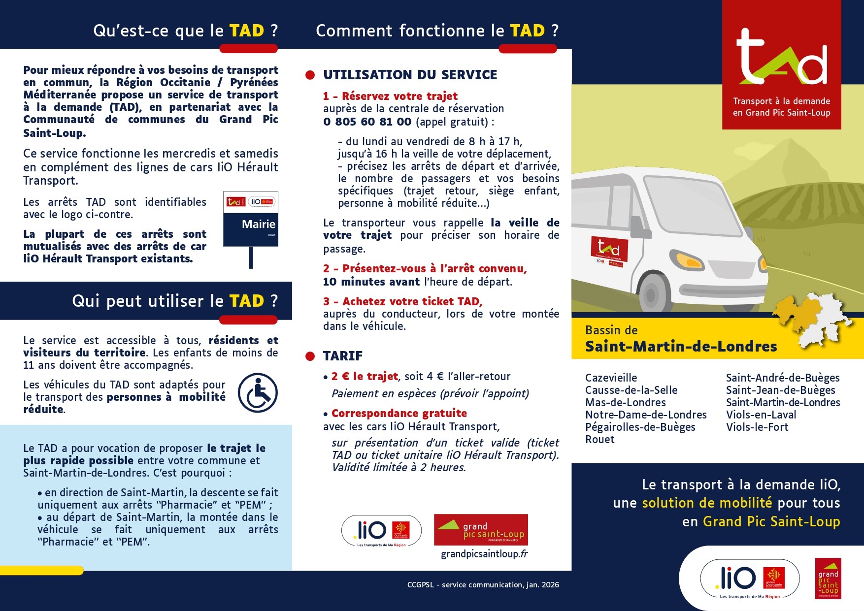 La CCGPSL a sollicité une délégation de compétence de la Région Occitanie pour l’organisation de services de transport à la demande sur le territoire. Le TAD propose une solution pour des besoins de déplacements ponctuels (recourir à des services, faire des courses…). Ce service vient compléter les lignes régulières du réseau liO Hérault Transport.