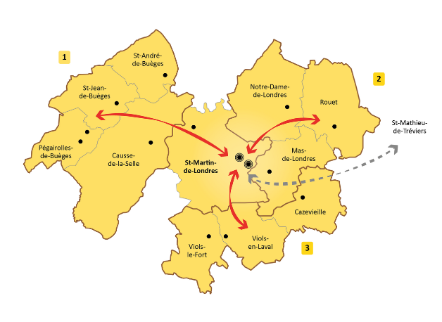 - Rabattement vers Saint-Martin de Londres depuis les secteurs 1, 2 et 3